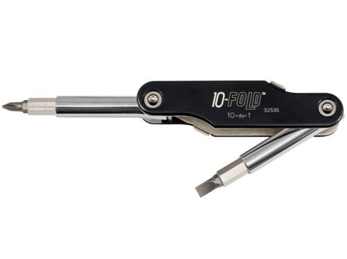- Folding pocket-style 10-in-1 tool with interchangeable bits - 8 screwdriver sizes and 2 nut drivers